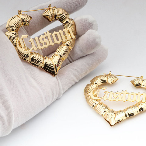 Pendientes en forma de corazón de aro de bambú con nombre personalizado de acero inoxidable chapado en oro de 18 quilates